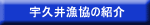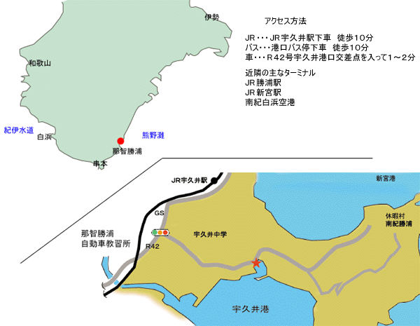 | ・宇久井漁業協同組合紹介 宇久井漁業協同組合(宇久井漁協)は、和歌山県南部那智勝浦町に位置した静かな港町に所在しています 年間漁獲高 300,000千円 主な水揚魚種 定置網・・・ブリ ワラサ 鰆 鯵 さばなど その他漁業・・・カツオ キメジ シイラ サザエ アワビ 伊勢えびなど