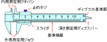 ノギスは、定規と幅を測る道具(バス)を一体にしたもので、副尺を利用することにより内側、外側、深さ、段差を1/20mmの精度で測定できる。