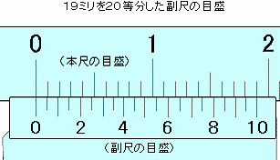 1mm右に動くと1が2mmの線と合い、0.9mm動くと9が合うことになる。主と副が会う線を読むことにより1/20mmの精度で測定できる。