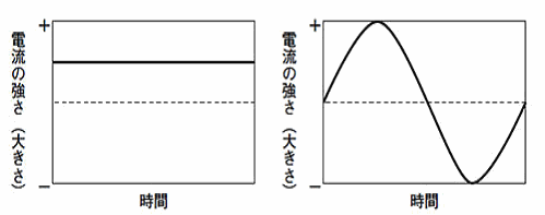 電池や車の電気は直流(左の図)で、電流の向きは一定です。車で家庭用の機器を使用するにはインバーターなどの変換機器が必要です。