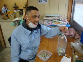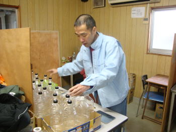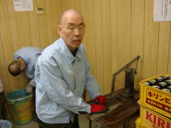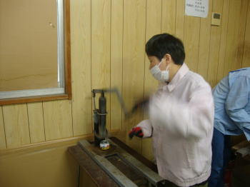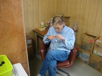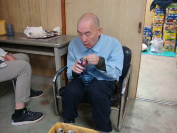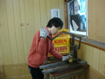 | アルミ缶をペチャンコに潰しています! | 僕はロング缶を潰す担当です。 |