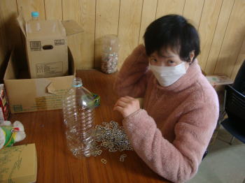 | どれだけのプルタブがこの中に入っているのかなぁ? | 僕はペットボトルにキャップを付けているよ |