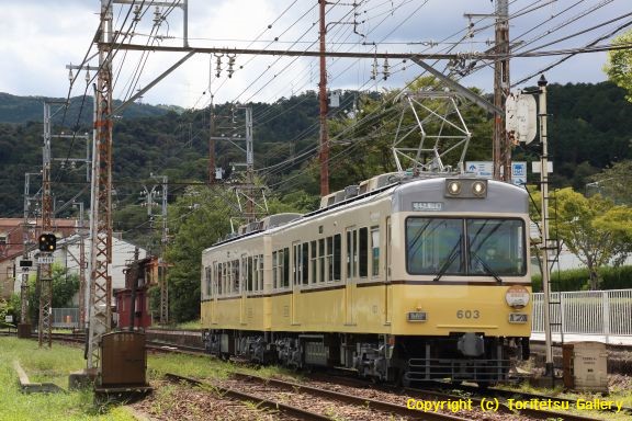 上栄町のびわ湖浜大津方面行きホームの裏の細い道を大谷方向に少し進むと、右手に長安寺に上がる石段のある踏切にでます。 元々急なカーブで電柱が多いうえに踏切の支柱や線路際の柵やらでカメラも構えにくい程ですが、なんとか隙間から妙光寺の前のSカーブを走る列車が撮影出来ました。 この沿線は住宅が途切れることが無く、背景を整理する為にどうしても縦アングルが増えてしまいます。